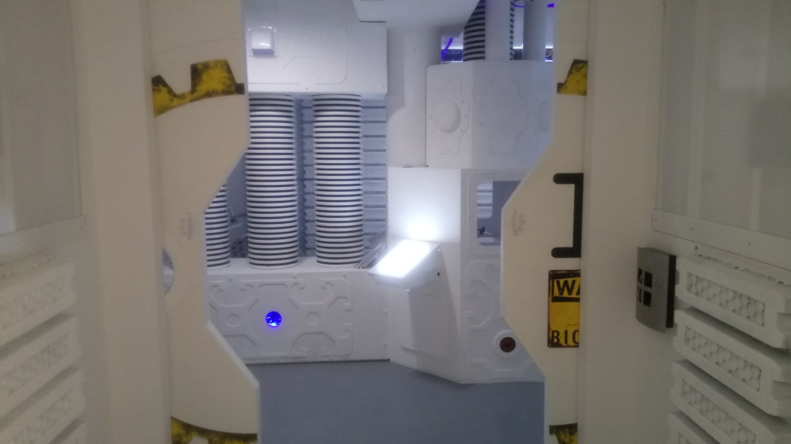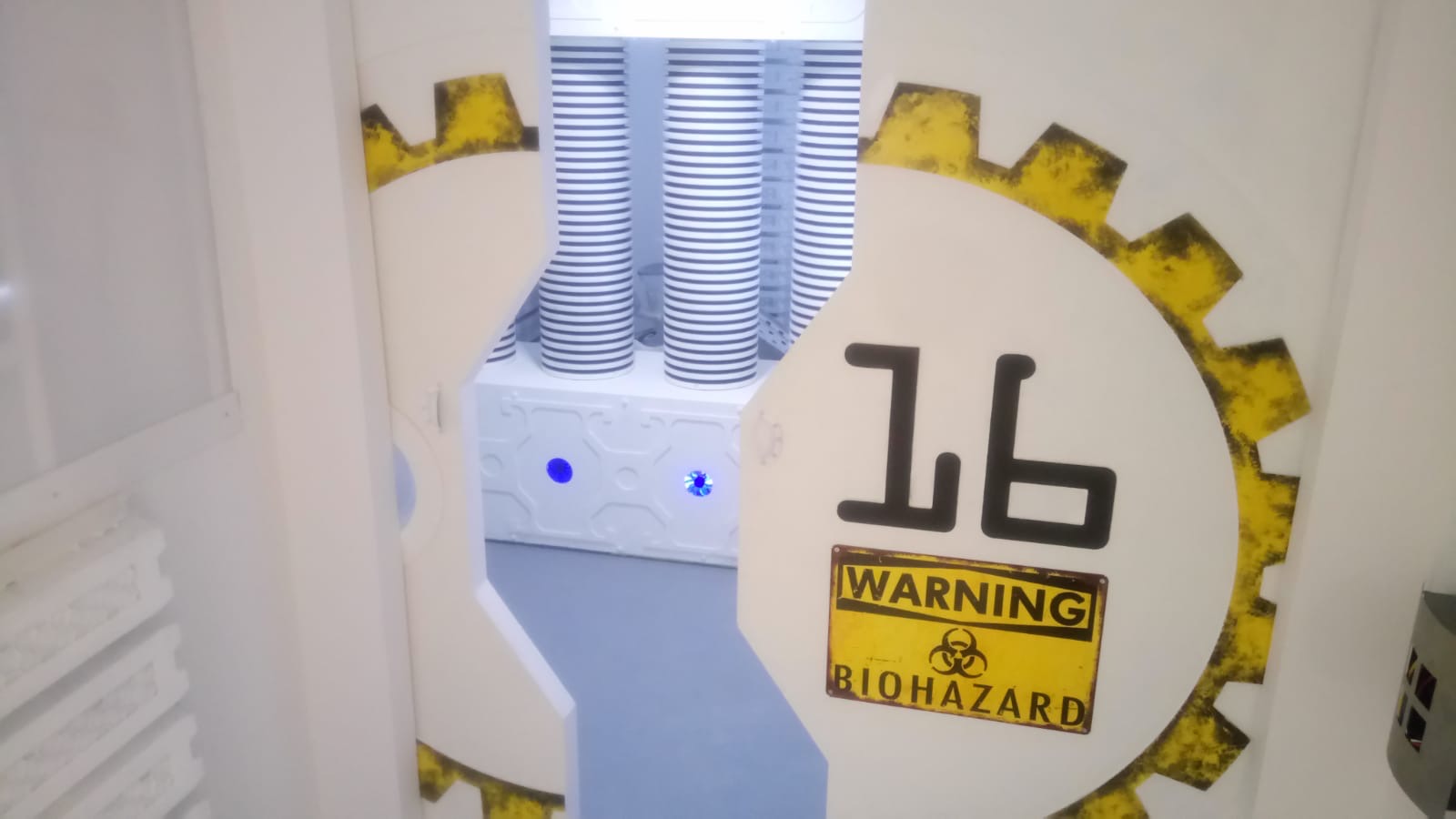 entrée dans le sas d’un escape game épuré type labo